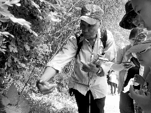 植物专家舒志刚正在教孩子们认识蝎子草。由于手掌没有毛孔,可以用手掌触摸蝎子草;手背毛囊丰富,一旦碰到,就有被蝎子蜇的疼痛感。北京晨报记者史春阳/摄
