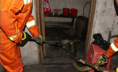当天16时许,该所接到报警称:防城区那良镇六市村仑河源头漂流景区一民房内发现一条蟒蛇,请求官兵前往帮助驱逐。