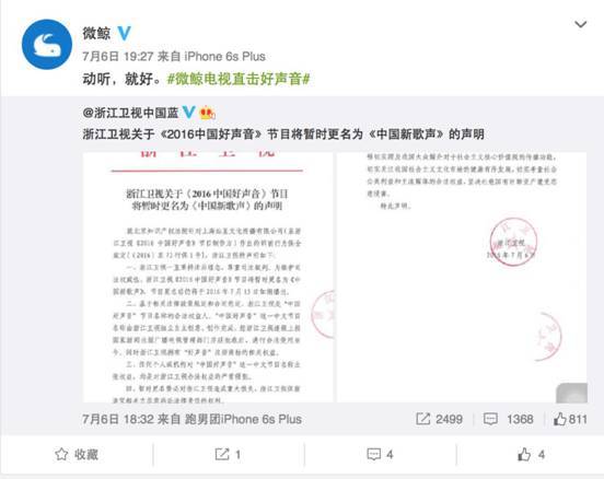 摘要:7月6日,浙江卫视发布关于《2016中国好声音》节目将暂时更名为《中国新歌声》的声明:“浙江卫视《2016中国好声音》节目将暂时更名为《中国新歌声》,节目更名后仍将于7月15日如期播出。”作为《中国新歌声》唯一指定的互联网电视微鲸随后在官微表态:“动听,就好”。