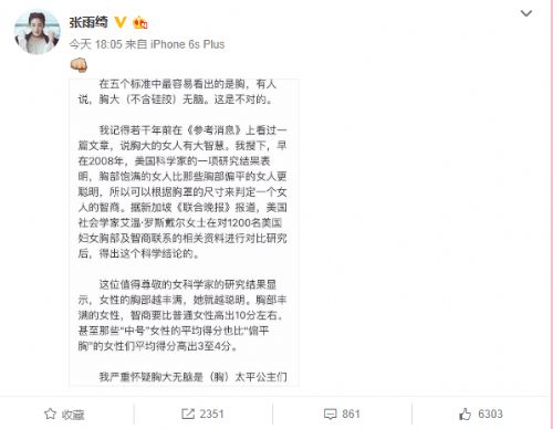 张雨绮驳胸大无脑 胸部饱满的女人更聪明
