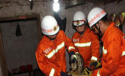 待人员和器材准备就绪后,边防和消防官兵一起将“擅闯”民宅的巨蟒成功捕获,待官兵们将该蛇拉直后测量发现蟒蛇长度竟有3米左右,经现场称重约25斤。后官兵将蟒蛇移交当地森林公安部门做进一步处理。