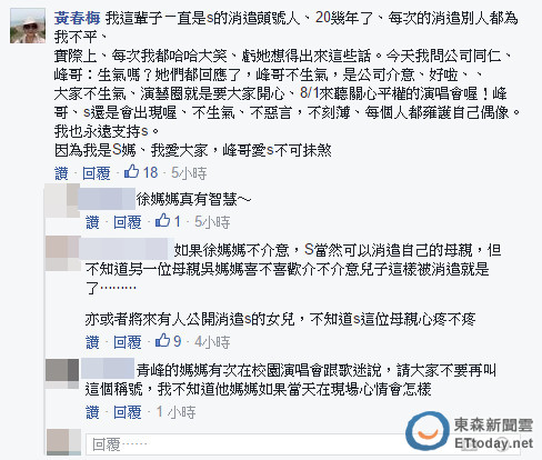 此外,S妈体谅粉丝护主的心,表示“每个人都拥护自己偶像”,而她也永远支持小S,力挺女儿到底。不过网友似乎仍然不领情,直指如果S妈不介意,小S当然可以消遣自己母亲,“但不知道另一位母亲吴妈妈喜不喜欢、介不介意儿子被消遣”,又或是还没有来如果有人消遣小S的女儿,不知道她会做何感想,更有歌迷指出,过去青峰妈妈曾在校园演唱会请歌迷别再叫这个称号,“不知道他妈妈如果当天在现场心情会怎样”,不过也有网友认为S妈说得话相当有智慧。