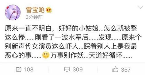 陈学冬还在该微博小号暗指某新生代演员踩着别人上位,并称:“万事别做妖,天道好循环。”