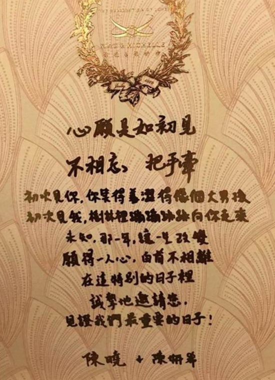 陈晓和陈妍希7月11日开始派送喜饼和喜帖给亲朋好友,喜帖内写着“心愿是如初见,不相忘,把手牵。初次见你,你笑得羞涩得像个大男孩,初次见我,树林里蹦蹦跳跳向你走来。未知,那一年,让一生改变,愿得一人心,白首不相离。”和大家一起分享他们满满的幸福喜悦。