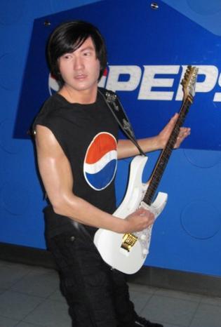 这是谢霆锋早年的蜡像,哦,天啊,这蜡像师是瞎眼了,还是怎么的,全身上下没有一点像谢霆锋的,更别说神韵了,完全没有早年谢霆锋那种放荡不羁的神采,如果不是那把吉他或许根本没有人会联想到谢霆锋。