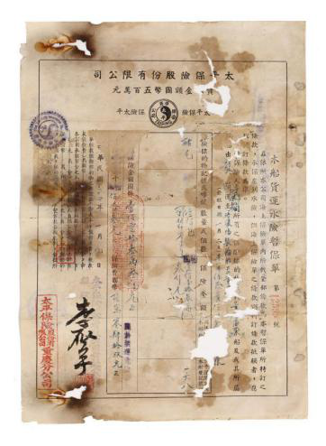 东北网12月11日讯 1945年元月2日的重庆,阴天。一张A4纸大小且看起来极不起眼的保单,被太平保险的办事员齐齐整整地码进文件夹中。谁也不曾料到,再次现世的时候,保单已浑身沾染油污,还有少许火烧和虫蛀的洞眼。仔细瞧它承保的物品,不禁让人唏嘘感叹。