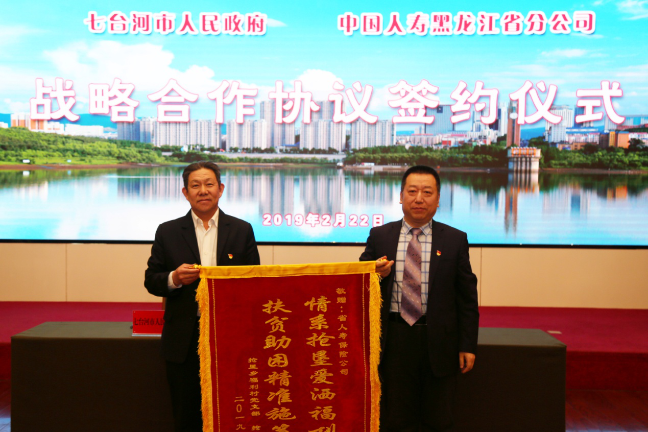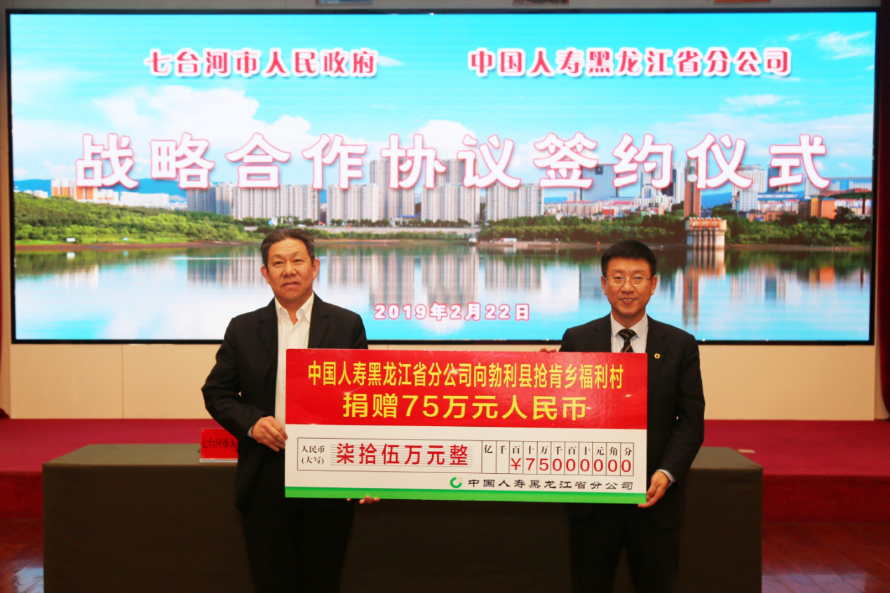 签约仪式上,中国人寿黑龙江省分公司向福利村捐赠了75万元扶贫资金,福利村向中国人寿驻村工作队赠送了锦旗。