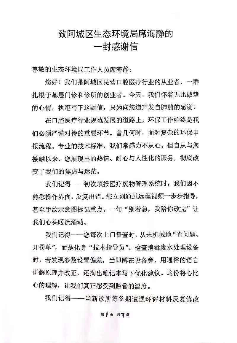 联名感谢信中特别提到了席海静的名字。在她看来,这正是工作的价值所在。“口腔诊疗环境的安全,直接关系到患者的健康。我们严格监管的最终目的,是帮助机构筑牢环境安全底线,让他们能更安心地为百姓提供优质的口腔健康服务。看到机构从困惑到合规,从被动到主动,再辛苦也值得。”这番话,道出了生态环保人的初心。